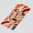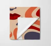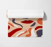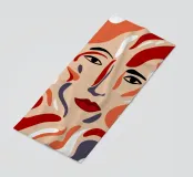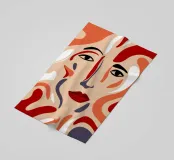 Un ritratto astratto e colorato in cui i tratti del viso sono definiti da forme organiche e fluide e linee decise in una tavolozza di rosso, arancione e beige.