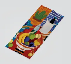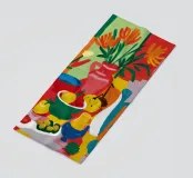 A modern, abstract still life of a table with a bowl of fruit and a vase of flowers. The deconstructed forms and bold, colorful shapes create a vibrant, energetic, and artistic composition.