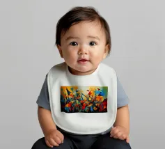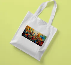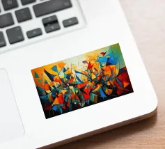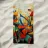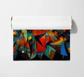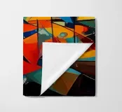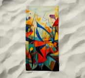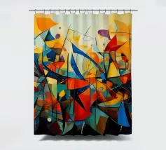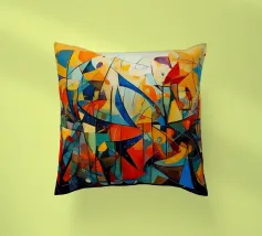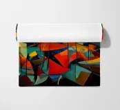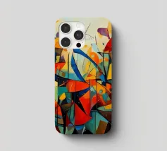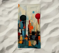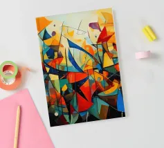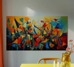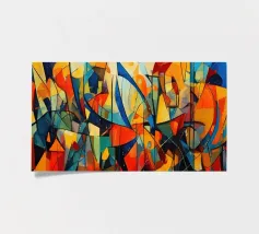 Un vivace dipinto astratto con forme geometriche interconnesse nei toni del rosso, del blu, del giallo e dell'arancione, che creano una composizione dinamica ed energica. Forme curve e angolari interagiscono armoniosamente su uno sfondo sfumato.