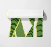 I motivi geometrici astratti a strisce verdi e gialle creano un senso di movimento nella composizione. Il disegno presenta elementi verticali di forma irregolare che suggeriscono un tema naturale.