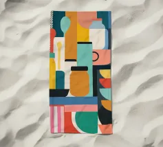 Una rappresentazione audace e astratta di elementi essenziali della cucina come le bottiglie di olio e aceto, resa in uno stile grafico e decostruito con colori primari.