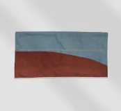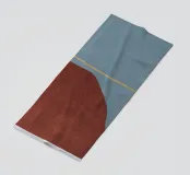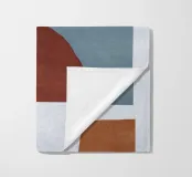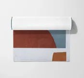 Forme geometriche e tonalità della terra creano un design moderno con linee e forme astratte. La composizione comprende rettangoli sovrapposti e un semicerchio, evidenziati da accenti dorati.