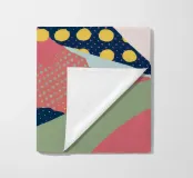 Un collage astratto dinamico e colorato presenta forme sovrapposte con vari motivi, tra cui pois, strisce e colori solidi, creando un'atmosfera gioiosa ed energica.