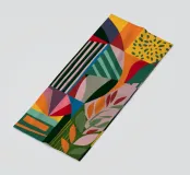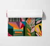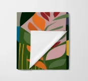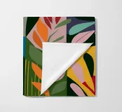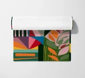 Una composizione astratta vibrante e dinamica, caratterizzata da un mix di forme di foglie colorate, motivi audaci come strisce e punti, e forme energiche. L'opera è una celebrazione moderna, gioiosa e artistica del colore e del design.