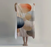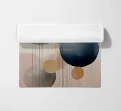 Una moderna composizione astratta con forme circolari sovrapposte nei toni tenui del beige, del pesca e del blu. Le linee delicate e le trame sottili creano profondità e movimento, mentre i puntini sottili aggiungono un tocco giocoso e raffinato. Questo design minimalista combina eleganza e fascino contemporaneo, rendendolo un pezzo versatile per gli interni moderni.