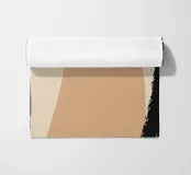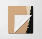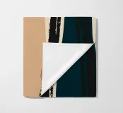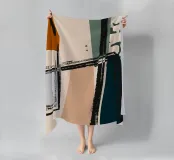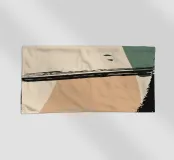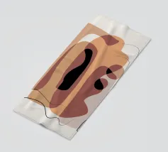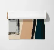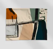 Forme astratte e pennellate decise nei toni della terra si combinano con uno sfondo chiaro. La composizione presenta rettangoli sovrapposti e schizzi a forma libera, creando un look dinamico e moderno.