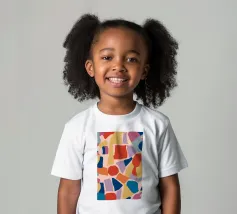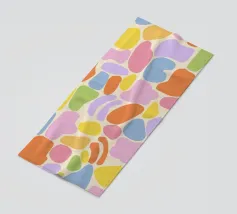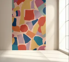 Un motivo astratto vivace e giocoso presenta forme colorate sparse come scaglie di terrazzo su uno sfondo neutro, creando un design festoso e moderno.