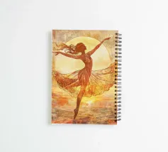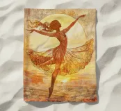 L'immagine mostra una donna in un'aggraziata posa di danza, con il suo abito fluente che si allarga mentre si muove. La scena è resa in tonalità calde che ricordano un tramonto, con il sole direttamente alle sue spalle che la immerge in una luce dorata. La texture artistica conferisce all'immagine una qualità sognante e quasi dipinta, enfatizzando ulteriormente l'atmosfera.