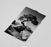 Fotografia di paesaggio, questa suggestiva opera d'arte in bianco e nero presenta un albero resistente in cima a una montagna.