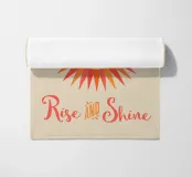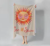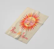Volto solare stilizzato in un caldo stile boho colorato e testo Rise And Shine.