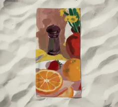 A beautifully chaotic still life of an artist or crafter table, with scissors, fruit, and other objects. The rich colors and dynamic composition celebrate the beauty in creative mess.