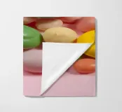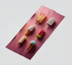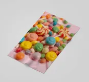 Un vivace mix di caramelle è distribuito su una superficie rosa, che mostra varie forme e colori, tra cui lecca-lecca roteanti e dolciumi rotondi. Questa disposizione giocosa invita a una gioiosa indulgenza.