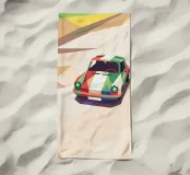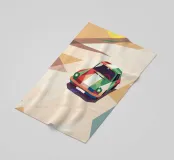 Illustrazione di un'auto da corsa con una combinazione di colori unica sulla strada con uno stile geometrico moderno.
