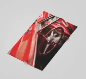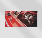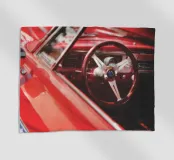 Gli interni, il volante e il cruscotto di un'auto d'epoca americana di colore rosso