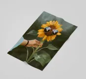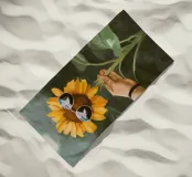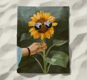 Giocoso dipinto digitale di un vivace girasole che indossa occhiali da sole da aviatore riflettenti, tenuto da una mano con un braccialetto casual. Questa affascinante e stravagante opera d'arte fonde natura e stile moderno, perfetta per gli amanti dell'arte botanica, dell'arredamento e dell'arte murale ispirata alla natura. Ideale per illuminare qualsiasi stanza con un tocco di calore estivo, vibrazioni allegre e arte pop contemporanea. Ottima idea regalo per gli appassionati di fiori, i collezionisti d'arte e i fan delle stampe uniche e creative.