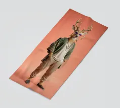 Una figura umanoide a torso nudo che indossa una maschera a forma di animale si erge solenne in una luce fioca e drammatica, che evoca mistero e simbolismo. La scena è ambientata su un fondale di tessuto semplice e scuro, che sottolinea un'atmosfera surreale e artistica.
