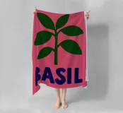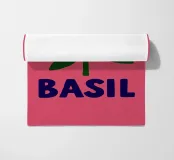 Un poster moderno di ispirazione pop art con il basilico come motivo grafico principale. Le foglie stilizzate di colore verde intenso spiccano sullo sfondo rosa acceso, completate dalla scritta "BASIL" in blu scuro. Questo design minimalista in stile Artezza gioca con i contrasti e i colori ed è perfetto come poster per la cucina, come decorazione per le piante o come elegante dichiarazione di erbe aromatiche per la vostra casa.