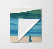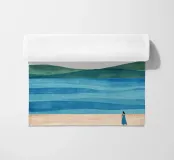 A woman walks alone on a soft sandy beach, the sun is setting on the horizon in a warm orange colour, and the blue water is softly lapping. The painting expresses a sense of inner peace and connection