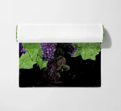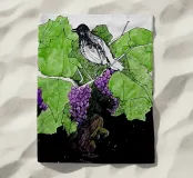 Un uccello è appollaiato su un ramo con grappoli d'uva viola circondati da foglie verdi. I colori vivaci dell'uva e delle foglie creano un contrasto sorprendente.