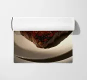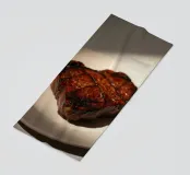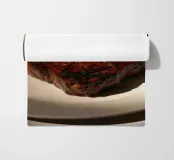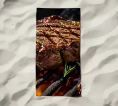 Una bella bistecca alla griglia è adagiata su un piatto bianco, ornato dai segni della griglia. La calda luce del sole mette in risalto i suoi colori ricchi, creando un'atmosfera invitante perfetta per il pranzo.