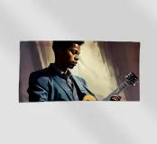 Un giovane chitarrista blues e jazz di colore nel bel mezzo di un assolo durante un'esibizione dal vivo.