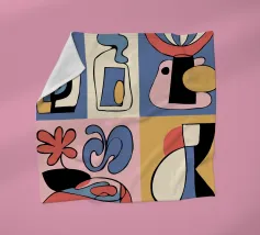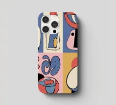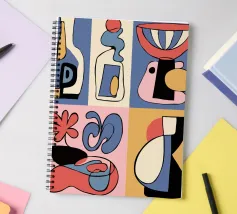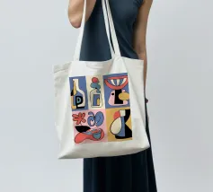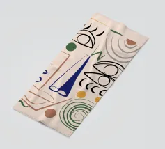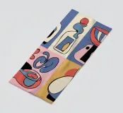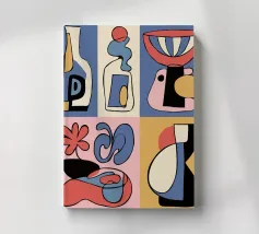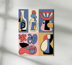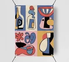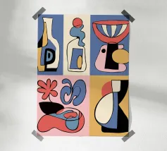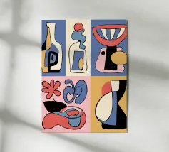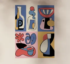 Forme audaci e astratte e colori vivaci formano una collezione di bottiglie e oggetti stilizzati, ognuno con un layout geometrico distinto. Le linee curve e le tonalità contrastanti creano un senso di movimento ed estrosità.