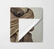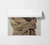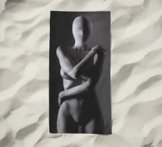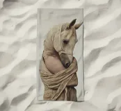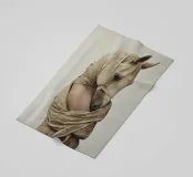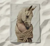 Un'immagine surreale che raffigura una figura umana con la testa di un cavallo, elegantemente avvolta in un tessuto beige strutturato. La composizione trasmette mistero, maestria e un senso di simbolismo ultraterreno, fondendo elementi umani e animali.