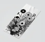 Una composizione botanica in bianco e nero presenta un assortimento di fiori selvatici e fogliame intricato e intrecciato. La composizione cattura varie forme e dimensioni, creando un ricco arazzo di elementi floreali.