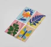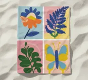 Un'affascinante griglia di quattro illustrazioni presenta un fiore, una felce, delle foglie e una farfalla, creando un bellissimo studio botanico in stile didattico.