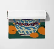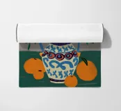 Elegante natura morta di un bouquet di fiori bianchi con verde lussureggiante in un classico vaso a motivi bianchi e blu, con arance sparse alla base.