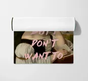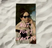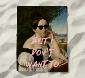 Una donna, con occhiali da sole moderni, guarda pensierosa mentre tiene in mano un libro. Il testo rosa in grassetto che attraversa l'immagine recita "MA NON VOGLIO".