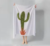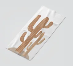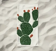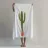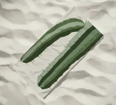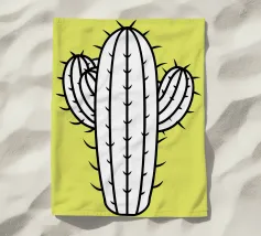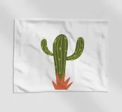 Un cactus stilizzato con tre braccia e dettagli a spillo si erge in alto. Alla base, una pianta arancione aggiunge un tocco di colore a contrasto.