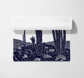 Una straordinaria illustrazione in stile linoleografico di un paesaggio desertico con cactus alti e strutturati sotto un sole radioso. Gli intricati disegni sulle piante e sul terreno creano un senso di profondità e di movimento, catturando la cruda bellezza dell'arida natura selvaggia.