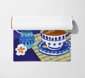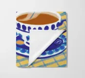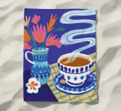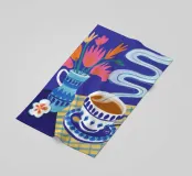 Illustrazione stravagante di una tazza di caffè fumante in una tazza a scacchi blu e bianchi, con fiori stilizzati che fluttuano sopra di essa, su uno sfondo blu scuro e ondulato.