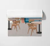 A stylish interior of a modern cafe with pink walls, a large blue sofa, lush green houseplants, and simple wooden tables. The scene is bright, inviting, and perfectly captures a chic, contemporary urban oasis.