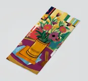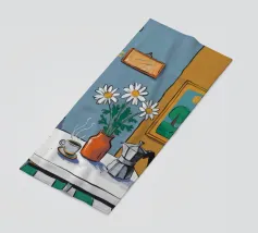 Una vivace natura morta con una tazza di caffè e un bel mazzo di fiori su un tavolo rotondo a fantasia. I colori ricchi e la composizione vivace creano una scena mattutina o pomeridiana allegra ed energica.