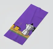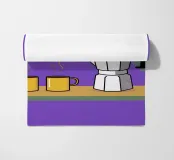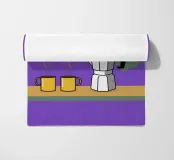 Una natura morta minimalista presenta una caffettiera argentata e due tazze da caffè gialle, pronte per essere riempite, su uno sfondo viola intenso.