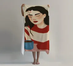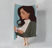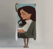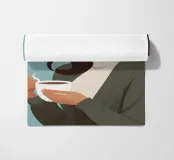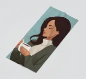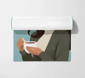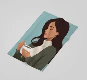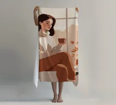 Una donna che tiene in mano una tazza di caffè caldo nella morbida luce del mattino. I toni delicati e le linee semplici ne fanno un'opera perfetta per le mattine lente e le routine tranquille.