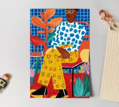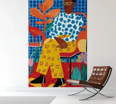 Una figura seduta con camicia a pois e pantaloni a fiori si rilassa tra piante vivaci e una parete a griglia blu.