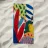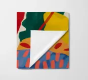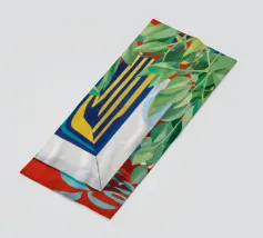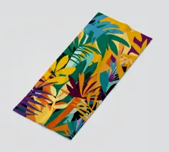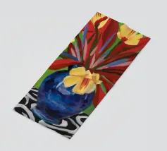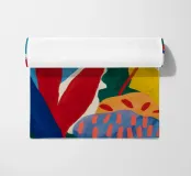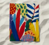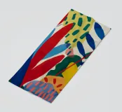 Una composizione dinamica e astratta di forme verticali, che combina foglie stilizzate e forme audaci in una ricca tavolozza di rosso, blu, viola e giallo, creando un senso di energia verso l'alto.