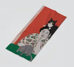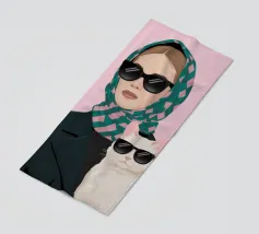 A portrait of a stylish woman in sunglasses, with a small black cat perched on her head like a hat. The composition is a fun, chic, and whimsical statement on fashion and the love of cats.