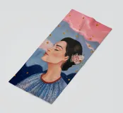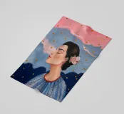 A serene profile portrait of a woman with dark hair, a white flower accent, wearing a blue dotted dress, set against a dreamy pink sky with scattered golden dots.