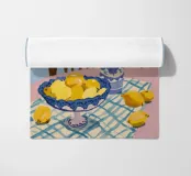 Una splendida natura morta con una ciotola di limoni e un bouquet di peonie rosa su una tovaglia a quadretti bianchi e blu. La composizione è fresca, affascinante e rappresenta perfettamente l'eleganza rustica dello stile europeo.