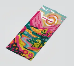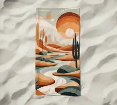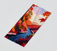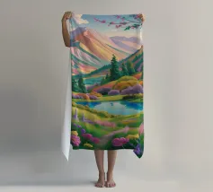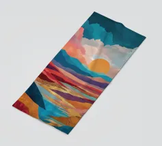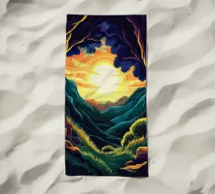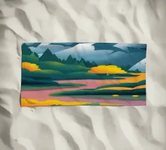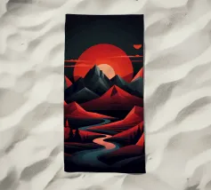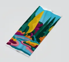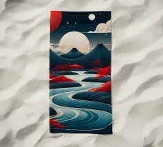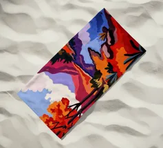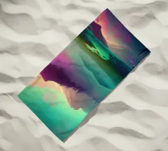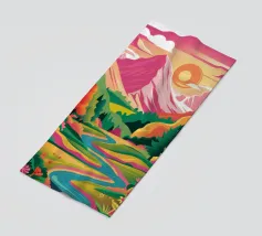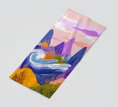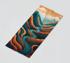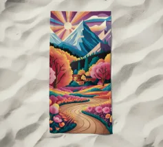 Si apre un paesaggio ipnotico, dove cime imponenti trafiggono un cielo pieno di sfere di luce. La scena è un tripudio di colori, con sfumature di arancio, rosa, blu e viola che si fondono senza soluzione di continuità. L'uso di linee spigolose e taglienti accostate a forme morbide e arrotondate crea una tensione visiva accattivante. Un fiume tranquillo si snoda nella valle, riflettendo i colori vibranti che la sovrastano. Quest'opera invita lo spettatore a esplorare un mondo in cui colore e forma danzano in perfetta armonia.
