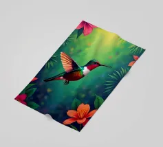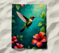 A drawing with coloured fineliners of a flying hummingbird.
