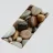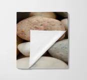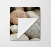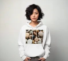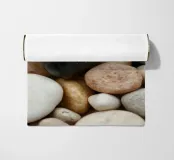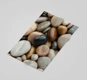 Una varietà di pietre di fiume lisce mette in mostra una serie di colori e dimensioni, appoggiate l'una all'altra. La luce si riflette sulle loro superfici, creando uno spettacolo sereno e naturale.