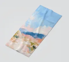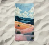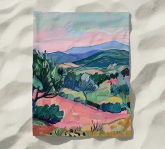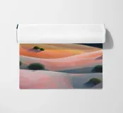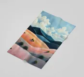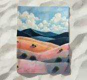 Morbide colline ondulate mostrano ricche sfumature di rosa, arancione e blu, mentre un cielo vibrante pieno di soffici nuvole esalta l'atmosfera tranquilla. Piccoli alberi punteggiano il paesaggio.