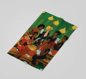 Un gruppo di persone è riunito intorno a un tavolo, impegnato in varie attività. Lo sfondo è verde.