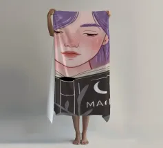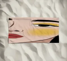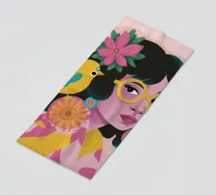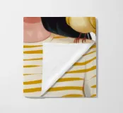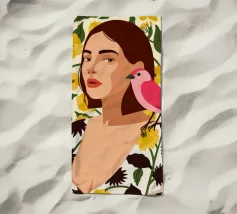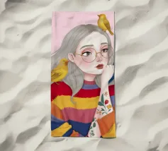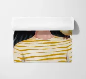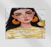 Questo dipinto ritrae una persona che indossa una camicia a righe gialle e bianche con grandi orecchini arancioni. Un piccolo uccello è appollaiato sulla spalla della persona, aggiungendo un elemento affascinante alla composizione.