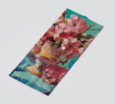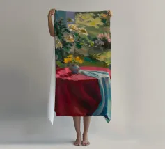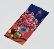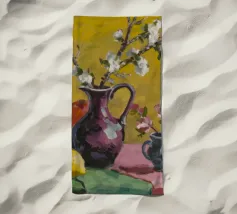 Un'audace natura morta con vivaci fiori rosso-rosa, forse papaveri o gerani, in un semplice vaso, accanto a fresche pere verdi, il tutto su una ricca tovaglia rossa che contrasta nettamente con uno sfondo blu intenso.